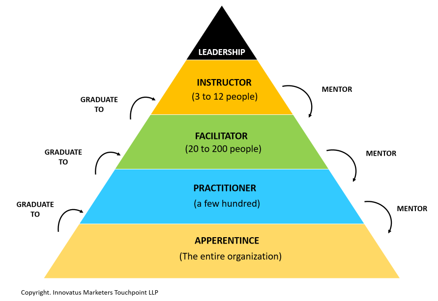We begin by cultivating expertise in select employees, whom we call "Instructors," through a specialized mentorship model. The "Instructors" are Experts or Masters, and adept at passing the methods and expertise to the "Facilitators" in specific areas, who act as change agents and Ambassadors.